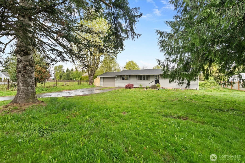 Charming 3-bed, 1.5-bath rambler on a spacious 11,761 sq. ft. lot! This 1,296 sq. ft. home features a full main bath off the primary bedroom and a convenient half bath off the galley kitchen. All kitchen appliances, washer, and dryer stay. Enjoy spacious living and dining areas, plus a heat pump for year-round comfort. Step down to an enclosed covered patio and fully fenced backyard—perfect for relaxing or entertaining. The oversized 432 sq. ft. garage offers great storage. A large paved driveway provides plenty of parking for vehicles, boat, or RV. Just one block from a city park and close to schools, shopping, and outdoor recreation!