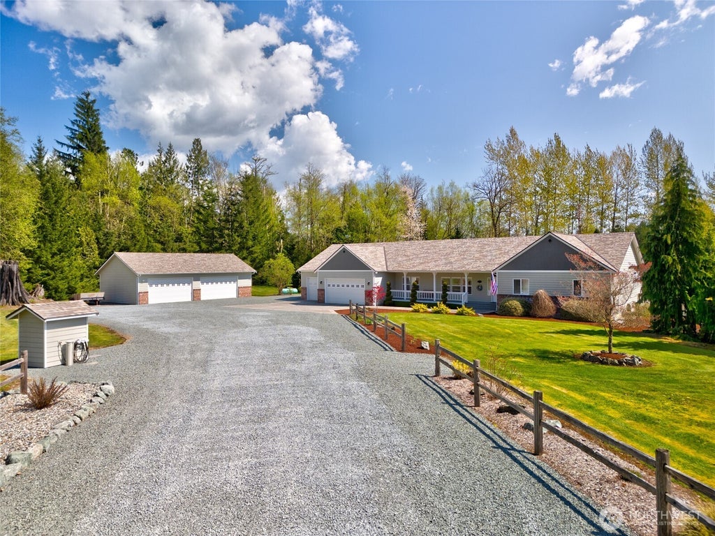 Welcome to your private retreat in Sedro-Woolley! This beautifully maintained 3-bed, 2.25-bath single-story home sits on 6.77 acres of manicured grounds. Enjoy 2,148 sq ft of open living space featuring a vaulted great room with oak hardwood floors and a fully remodeled kitchen with granite countertops, custom cabinets, and stainless steel appliances. The spacious primary suite offers a walk-in closet and en-suite bath. Step outside to a large composite deck perfect for entertaining or relaxing. A 3-car attached garage and detached shop provide plenty of room for hobbies, storage, or toys. With a new roof on both the home and shop and a completed pre-inspection, this home is truly move-in ready! This is the one you've been waiting for!