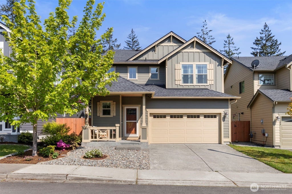 Desired & Dialed-in Home in Silverdale's Woodbridge Community! Enter to a vaulted ceiling & modern wide plank laminate flooring. Open-concept kitchen & living. Gourmet kitchen with quartz countertops, SS appliances, gas range, & pantry. Gas fireplace in living room. Built-in office nook. Upstairs there is a spacious primary suite w/ 5-piece ensuite & walk-in closets. Also, an additional 3 bedrooms, full bathroom, & laundry room: washer/dryer included. Private fully fenced yard overlooks protected neighborhood greenbelt, spacious patio with TV. Mountain Views, A/C, two-car garage with epoxy sealed floor & storage racks. Easy access to the private community park and dog park. CK school district. Minutes to base, shopping & hospital.