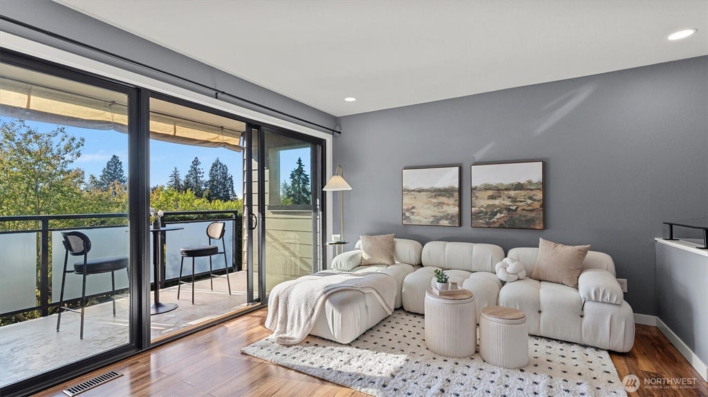 Stunning sunset views with winter mountains & lake views! Designed by an award-winning architect, this home seamlessly blends modern sophistication with smart functionality. Located just moments from Google, coffee, local shops, & scenic parks—walkability at its best. $30,000 in recent upgrades include a brand-new heat pump for efficient heating and cooling & enhanced living room lighting. The spacious primary suite offers a private fenced patio. 2020 renovations added $50,000 worth of high-end improvements including a fully remodeled kitchen, stylish bathrooms, rich wood flooring, & a warm, inviting fireplace. Two reserved parking spaces & three separate storage units. A flexible bonus area for office, gym, or creative space.