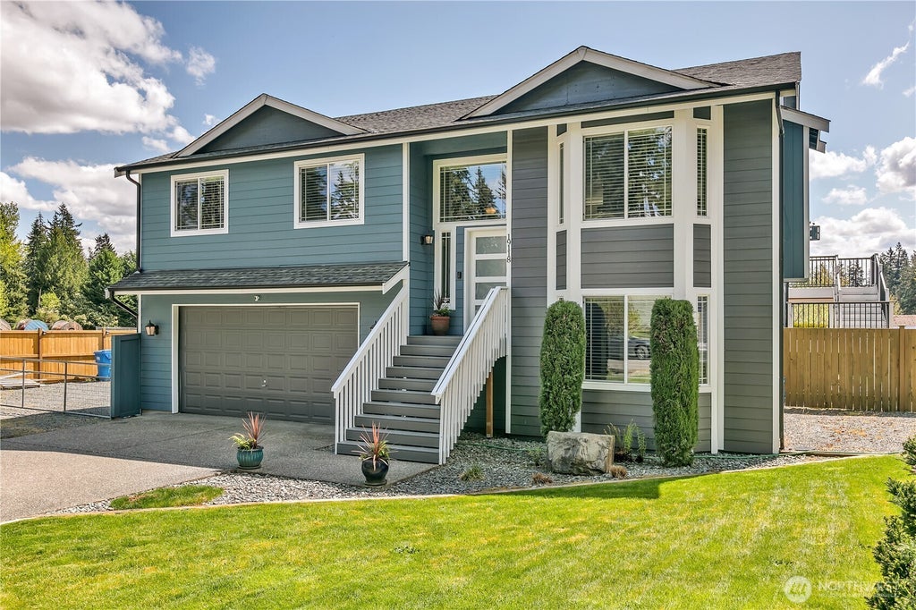 This well maintained home has lots to offer. Located on a corner lot, dead end street and backs to an elementary school. Has rights to Lake Tapps parks, including Jenks (boat launch, private beach, etc.) The exterior has fresh paint. A huge Trex deck with heated covered area off of the primary bedroom. Also a hot tub, fully fenced yard, RV parking and an attached shed/shop area with roll up door and access to 2 car garage. Inside is a well designed kitchen with lots of storage with refer included, gas fireplace in living room, a fully finished basement with 3/4 bath and huge flex room. Plumbing for a wet bar in basement. Great space for many uses. Must see to appreciate all the upgrades and plusses in this home.
