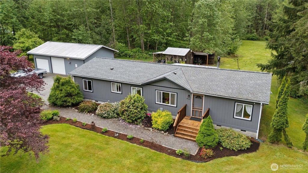 Experience the charm of quiet country living! This property boasts a 2019 roof, updated carpet, and stylish vinyl plank flooring. The kitchen showcases refinished cabinets, Corian countertops, and a seamless sink. Cozy up with a pellet stove or convert the open fireplace to wood. Fresh interior paint, a private primary suite, and convenient laundry with a folding counter complete this exceptional home. Enjoy mature landscaping, a barn, and a spacious horse pasture. A circular driveway offers ample parking for your toys. The heated 3-car (24x36) shop features extra storage and 220V electrical. Fruit trees, a walnut tree, and blueberry bushes add natural beauty. Apx 2 miles to Lake Bosworth boat launch and just 5 miles to Granite Falls.