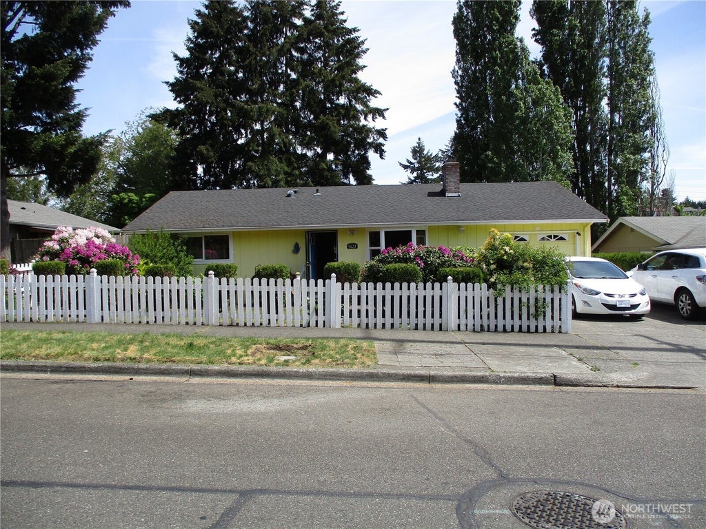 Wow! Fantastic opportunity here with this home located in So. Tacoma. Offering more than 1300 sq ft, giving you 3 bedrooms which easily can be converted back to the 4th bedroom! One will notice the mature landscaping and groomed yard. There is a white picket fence to greet you. Upon entering, a wood burning fireplace in the living room. Continuing on to the large kitchen with eating space. Large garden window looking out to the back yard. The primary bedroom was converted from 2 bedrooms to one to help care for their mother. Can easily be converted back to have 4 bedrooms. Full bathroom located in the hallway. Out thru kitchen is laundry area in back of the garage. There is a half bath there. Walk out to your backyard oasis!