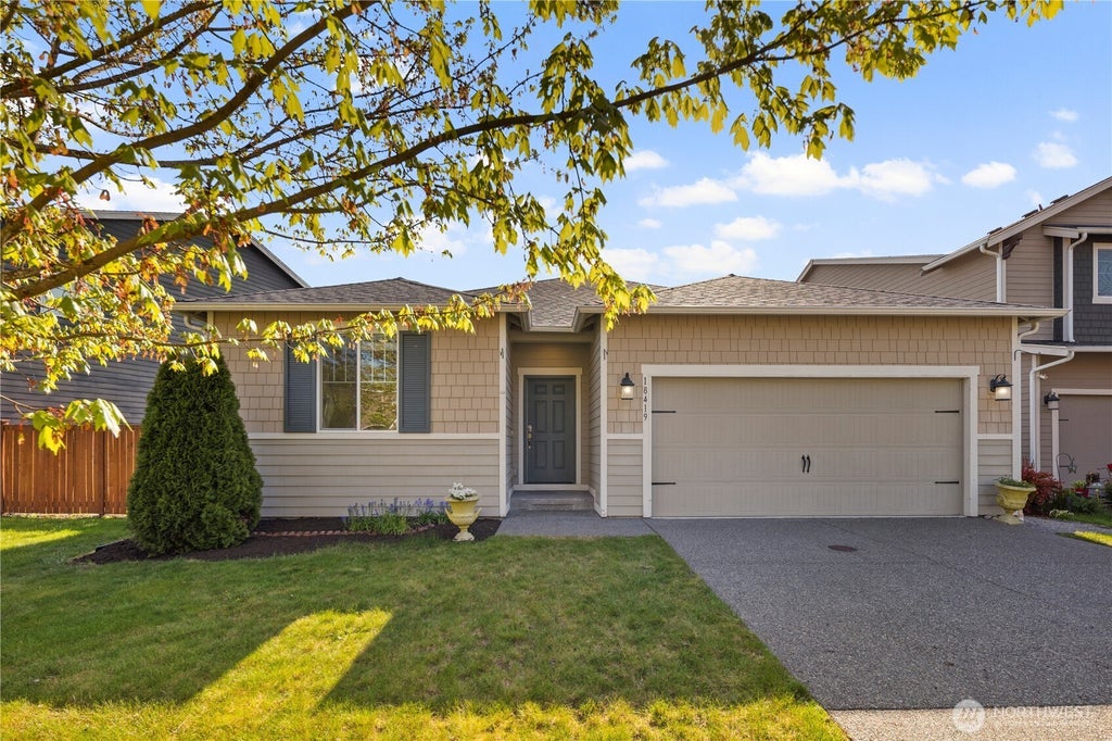 Come see this well maintained Rambler in a great neighborhood! You'll love this functional open-concept layout with 9ft ceilings. Large kitchen island with granite counters, white cabinets & SS appliances plus a massive walk-in pantry. Laminate hardwood floors throughout living spaces plus all new interior paint and carpet. Move Right In! Primary Bedroom features walk-in-closet and large 5pc bath, fully fenced backyard with gas hookup. Community features include two parks, playground & basketball court. Prime location near freeways, restaurants, shopping, and JBLM!