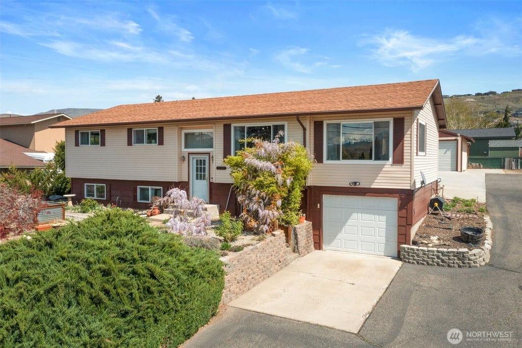 Spacious East Wenatchee home with multiple entry points, sweeping views, and rare garage setup on a 0.29-acre lot. Enjoy both a front entrance and ground-level access in back, plus an attached single-car garage and a detached two-car garage/shop—ideal for storage, hobbies, or extra parking. Inside, this 2,500 sq ft home offers 3 bedrooms, 2.5 baths, and a bonus room that can function as a 4th bedroom, office, or den. The flexible split-level layout supports a variety of living needs. Located just two minutes from the Apple Capital Loop Trail, this property includes irrigation, raised garden beds, and a generous yard—offering comfort, functionality, and space to grow.