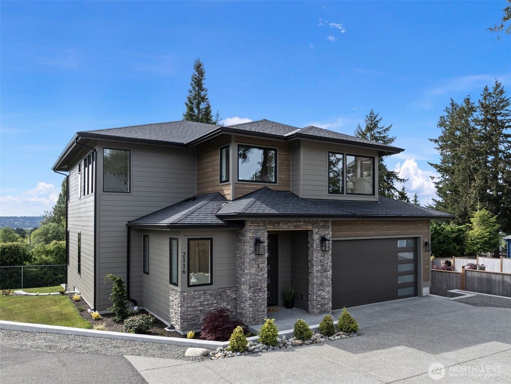 Beautiful brand-new home by Mykland Construction, tucked away on a private lane within the University Place School District. Modern exterior design with 4 bedrooms + an office featuring built-in cabinetry. Appointed with 9ft tall ceilings, engineered hardwoods, a gas fireplace, high-base molding, and fully wrapped windows. The sleek kitchen boasts quartz counters, full tile backsplash, soft-close custom cabinetry, and a coffee station with open shelving. Upstairs offers partial mountain & sound views, a luxurious primary suite, and a conveniently located laundry near all bedrooms. A covered deck, AC, EV-ready finished garage, gutter guards, fully landscaped yard with sprinkler system, and no HOA dues complete this stunning package.