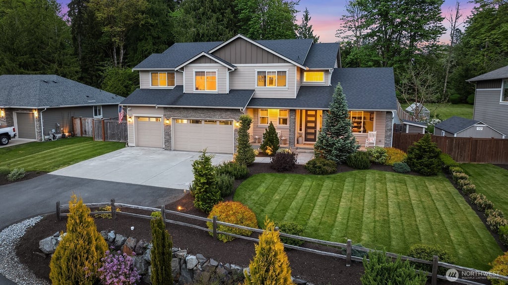 Minutes from historic Downtown Monroe! Welcome to this stunning 4-bed, 2.5 bath home, settled in an exclusive gated community, offering a private lake & tranquil walking trails. The model home kitchen features marble backsplash, double ovens, gas cooktop, & a cute wine bar! Dining area flows seamlessly to covered outdoor living space w/a cozy gas fireplace-ideal for BBQs or sunset conversations. The half-acre yard is fully fenced w/stone pathways, outdoor lighting, & brand-new wired greenhouse. Retreat to your primary suite w/plenty of space, soaking tub & custom closet. Main-floor bonus room, office, & striking designer touches throughout! Enjoy the 3-car garage with high-end storage & wired Generac Generator and amazing Monroe Schools!