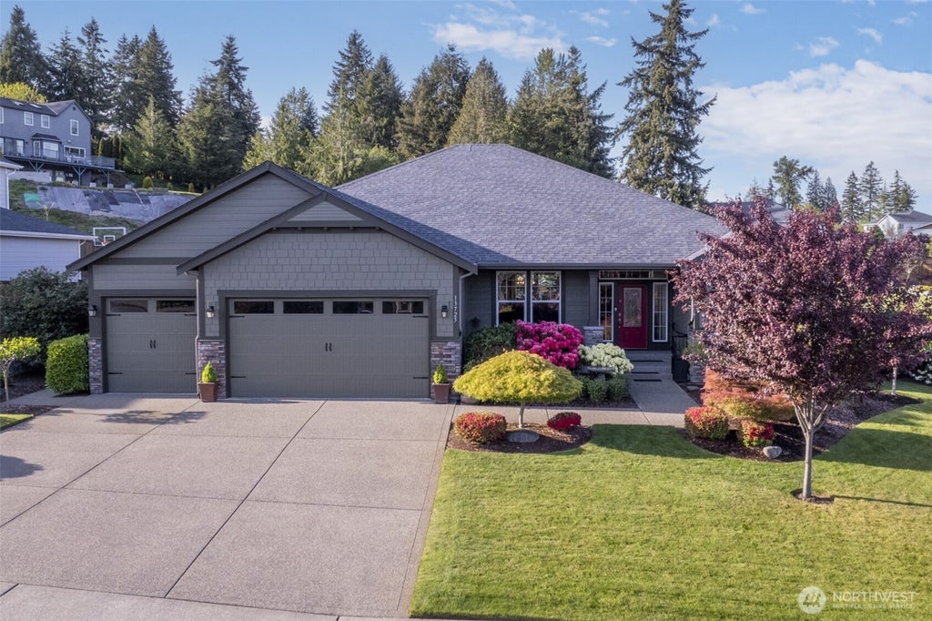 Nestled in Puyallup’s sought-after Shawnee Ridge community, this meticulously maintained rambler offers the best in single level living. Spacious, light filled great room & kitchen w/ 10’ ceilings. Enjoy a cup of coffee while watching the sunrise behind Mt Rainier from the front porch. Beautifully landscaped backyard w/ water feature, & covered back deck, gas fp + BBQ hookup provide the perfect space for outdoor entertaining. Primary BR, walk-in closet, ensuite BA w/ heated floors. 2 add'l BR plus office (w/ Mountain views). Many great features include engineered hardwood floors, granite countertops, AC, wired alarm system. Fully fenced, front/side/back yard sprinkler system, 3 car garage. Easy access to amenities. This is a must see home!
