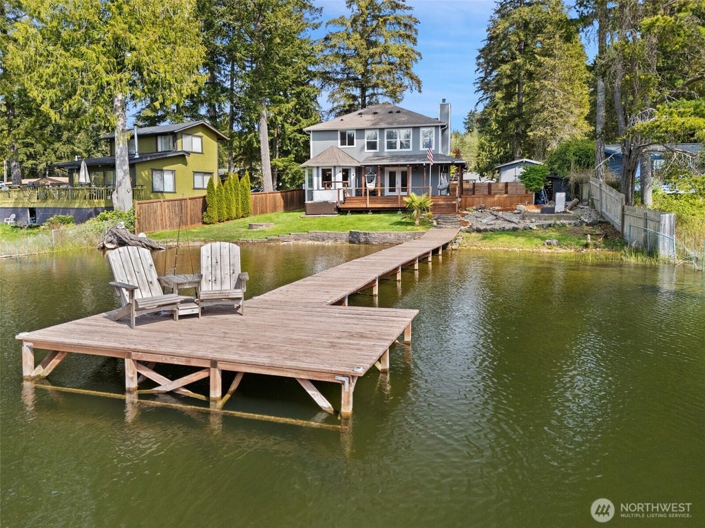 WELCOME HOME TO YOUR LAKEFRONT OASIS! Living with the water just steps from your door! Sleek finishes & abundant natural light, modern kitchen w/ granite countertops, luxurious bedroom suite w/ ensuite bathroom & California closet, plus a cozy living room with wood stove—all overlooking breathtaking lake vistas. Step outside to a pristine lake, your own private dock, & a spacious deck w/ top of the line hot tub, ideal for summer fun, relaxation, & entertainment. The lake, known for its exceptional cleanliness, offers the ultimate backyard pool experience, perfect for swimming, kayaking, & fishing enthusiasts—stocked 3x yearly. Also includes carport, 2 storage buildings.