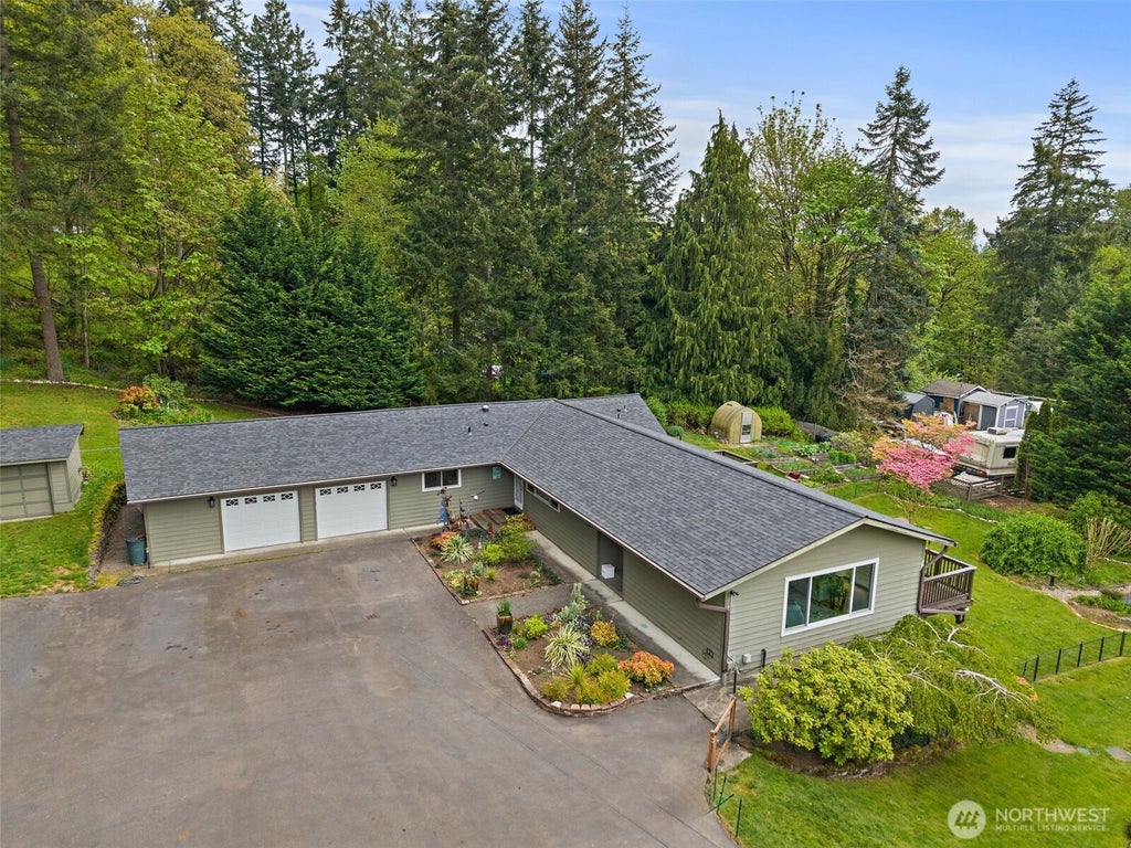 Sprawling daylight basement rambler on a gorgeous, park-like acre with a brand new septic system! Boasting over 4,000 sq ft, this home offers 5 bedrooms, 3 full baths, 2 full kitchens, and multiple living and entertaining spaces—ideal for multi-generational living, rental potential, or a home-based business. The attached garage features new doors, plus there’s a large detached shop and tons of parking for RVs, boats, or guests. Enjoy the expansive deck and patio surrounded by lush, landscaped grounds. Gardening lovers will appreciate the greenhouse, raised beds, and room to expand. A rare blend of space, flexibility, and serene privacy!