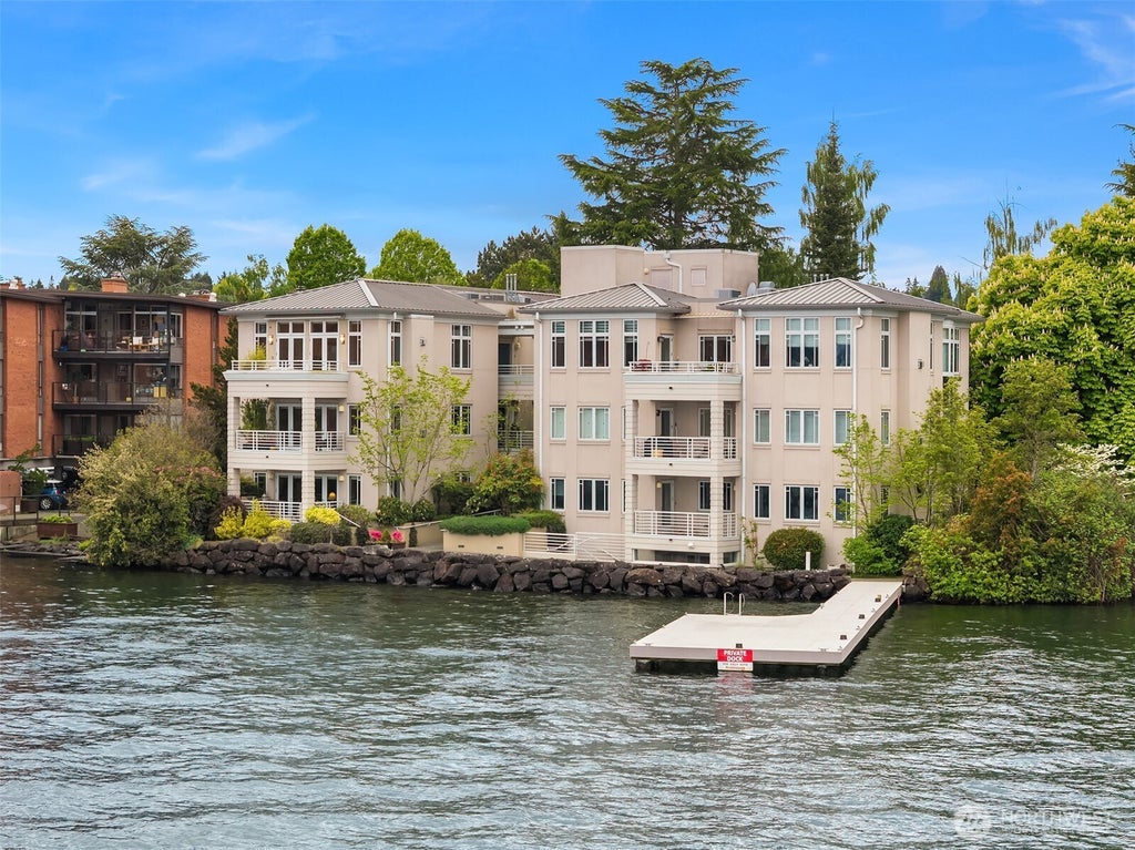 Coveted opportunity at Madison Point. This top-floor penthouse w soaring ceilings captures stunning views of Lake Washington. Light-filled interiors flow effortlessly, featuring double French doors to two private balconies, chic hardwoods & a stylish fireplace. Open-concept living spaces perfect for entertaining. The primary suite is a true retreat w a deep jetted tub, vanity, walk-in closet & a charming bay window w a cozy alcove overlooking lush greenery. Enjoy gated entry, two secure parking spaces & access to the private community dock. Rarely available, the boutique building offers an elevated lifestyle in the heart of Madison Park. Close to vibrant shops, cafés & parks — experience the best of lakefront living!