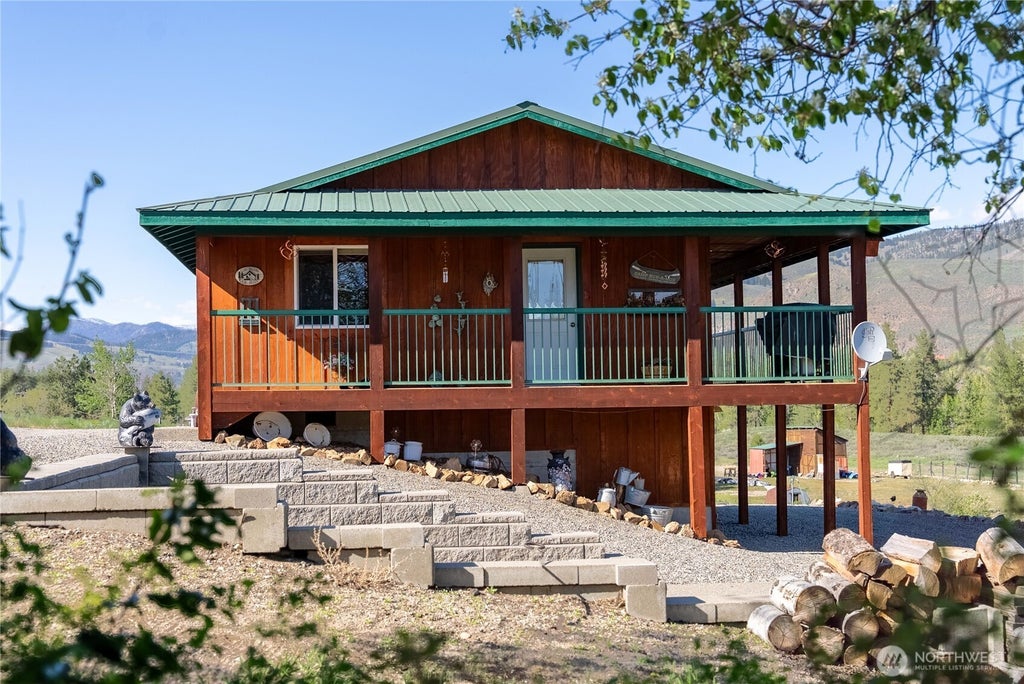 Sun-lit spotless 768 sf cabin is just right, near the Old West Town of Winthrop. 1 story level has 2 Bed/1 Bath. Full Kitchen. Real wood cabinets & includes appliances. Interior shines. Gleaming pine-wood ceilings & white tile floors. Kitchen, dining and living room has Mountain views. Covered decks. Natural landscape with gravel driveway. Heirloom Apple trees. Abundant Wildlife seen here. Small shop outbuilding/storage area. Individual well & installed on-site septic system. Lots of parking for friends and guests. Fun outdoor patio w/ firepit for gathering. Unfinished walk-out Daylight basement is yours to finish as you like. Utility room spacious.(2) Deeded walking easements to River. Take a swim & splash your feet in the Chewuch River!