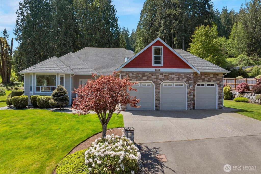 Welcome to this exceptional rambler set on a full acre in the sought-after Aspen neighborhood. This beautifully landscaped property backs to a peaceful greenbelt and boasts scenic mountain views. The gourmet kitchen is a chef’s dream, featuring a large breakfast bar, granite countertops, double ovens, wine fridge, mini fridge, and a cozy eating nook. Spacious family room offers soaring ceilings, a gas fireplace, and direct access to the backyard. Rich cherry hardwood floors flow through the entry, hallway, living, and dining rooms. Retreat to the luxurious primary suite, complete with its own gas fireplace, a spa-like five-piece bath, walk-in closet, and a private slider to the yard. Outside, entertain in style under the large covered patio