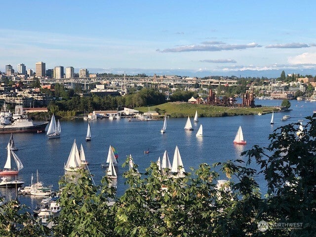 The Atwater Condominiums, a small boutique building perfectly located to take advantage of all the City has to offer. The quiet, walkable location is minutes to Fremont, Lake Union, Seattle Center, downtown as well as Aurora Ave & I-5 for points North & South. The home features wide open views of Lake Union as well as the Cascade Mountains. It never gets old watching the boats & float planes coming & going. With walls of glass, the home enjoys bright natural light. The generous floorplan offers 3 bedrooms (one non-conforming), 2 bathrooms, open design living room, dining room & kitchen + a laundry room all on one level. Secure 2 car garage. Simply nothing to do but to move in & invite your friends over for the Fourth of July! Welcome home.