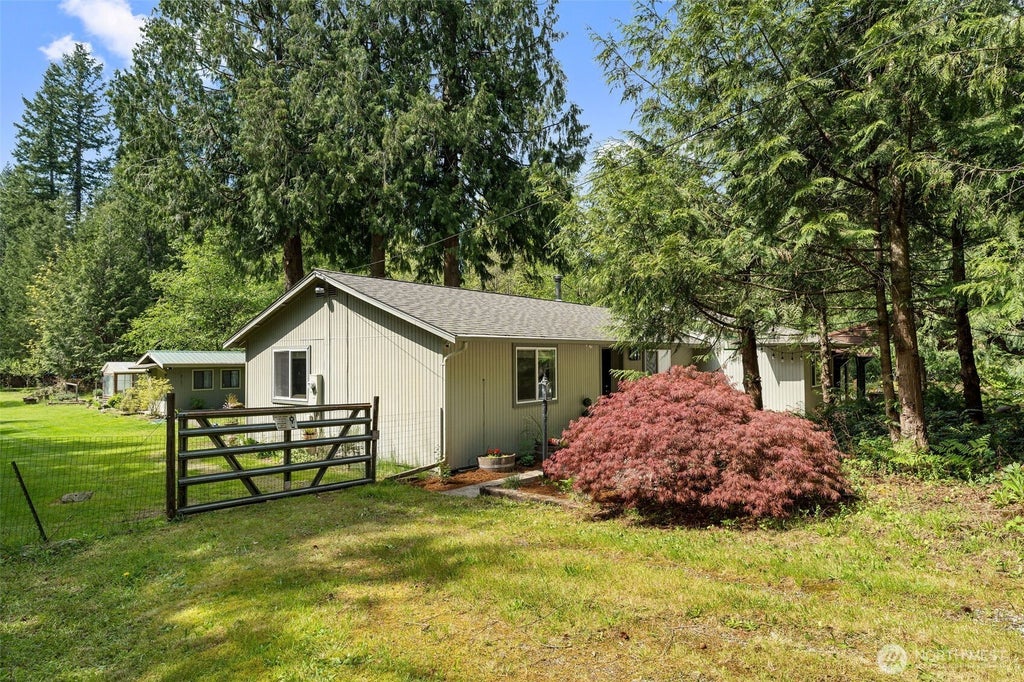 Hobby farm potential on 1.25 acres. Brightly lit, updated kitchen features cherry cabinets, granite counters, gas cooktop, double ovens, copper sink, walk-in pantry with farmhouse door & more. Eating bar connects to dining & family rooms with hardwood floors and a high-efficiency woodstove. Spacious primary suite with ensuite bath offers dual vanities, full sized tub & walk-in closet. There's two more bedrooms plus another full bath. Central vac system, Mud/laundry room off garage. 50-year Malarkey anti-moss roof, 24-ft metal carport, 8x12 insulated workshop with 240V, greenhouse with power, raised garden beds w/irrigation, and a massive 5-bay woodshed (holds 20+ cords) with power and lighting. Bring your mini farm dreams and your chickens!