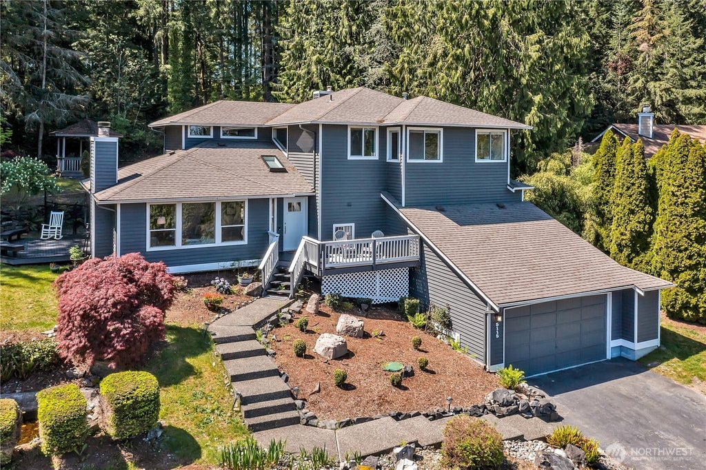 Stunning Central Kitsap contemporary tri-level w/ peek-a-boo views of Dyes Inlet & The Cascades! Delightful 1/3 acre private setting features 4 bedrooms and 3 baths plus a spacious study. Open concept living that will make an entertainers dreams come true. Gorgeous kitchen with SS appliances, granite counters & large butcher block island w/ eat in breakfast area opening to secluded fenced brick terrace with gazebo and hot tub hook ups. Primary suite is light & bright, highlighting the remarkable view, w/ generous walk-in closet & bath. Cozy living and family room with fireplaces, large 2 car garage, and additional deck areas off of both the dining and family rooms. Newer roof, flooring and paint. Easy access to bases, freeways, schools.