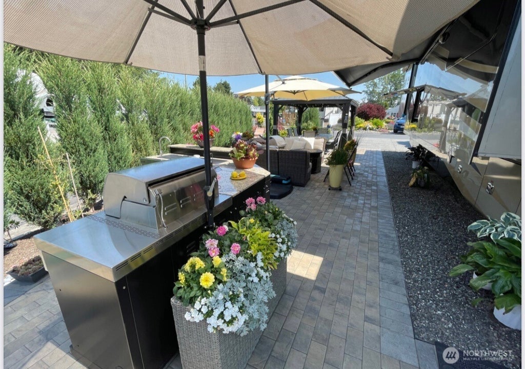 Welcome to Latitude 49 Resort Park! This spacious corner 180-day lot features beautiful, professionally designed landscaping that offers a true sense of privacy and retreat. With irrigation, solar lighting, and mature junipers lining the edges, every detail has been thoughtfully planned. The 4-piece granite outdoor kitchen and spacious lounge area with umbrella make entertaining easy. Relax year-round on the large paver patio under the heated gazebo. There’s also a charming outbuilding with electrical—perfect for storage, hobbies, or a cozy hangout. With 50-amp power and sewer hookups, it’s RV-ready for easy pull-in. Enjoy resort-style amenities: clubhouse, pool, pickleball, gym, laundry, and more—all just minutes from Birch Bay beaches!