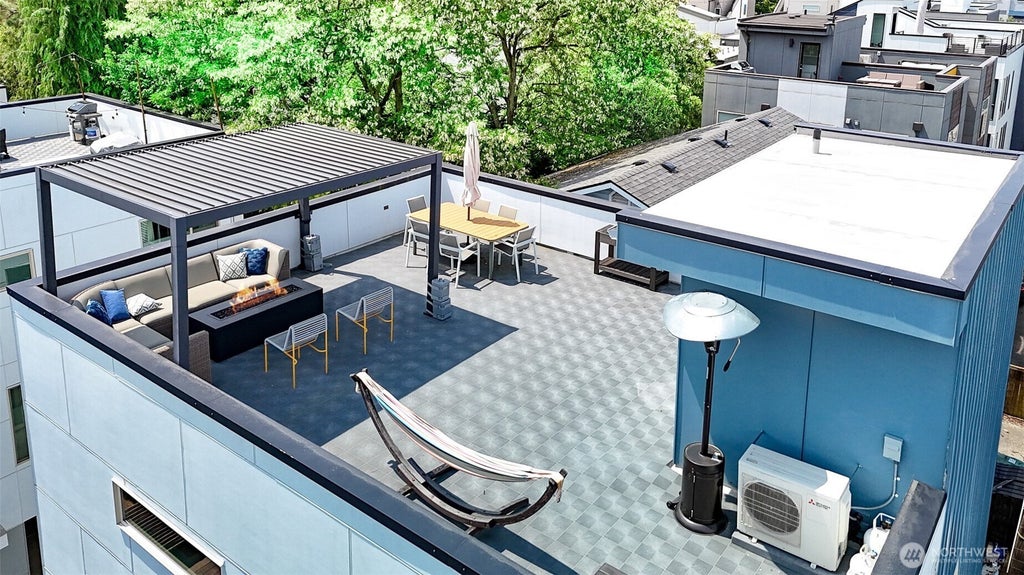 Stunning detached townhome in the heart of Ballard. This spacious 3 bedroom/3.25 bath home features gorgeous light filled living areas perfect for entertaining. The main level showcases a gorgeous open living area with beautiful gas fireplace, open kitchen with large kitchen island and stainless steel appliances, private deck and half bath. The entry level has separate living with a guest suite perfect for guests or home office. Upper floors feature two additional beds and baths. Don't forget to check out the expansive rooftop deck with city and mountain views, perfect to enjoy the sunshine on the gorgeous sunny Seattle days. The home has a valuable private garage and air conditioning. Unbeatable location just blocks from grocery stores.