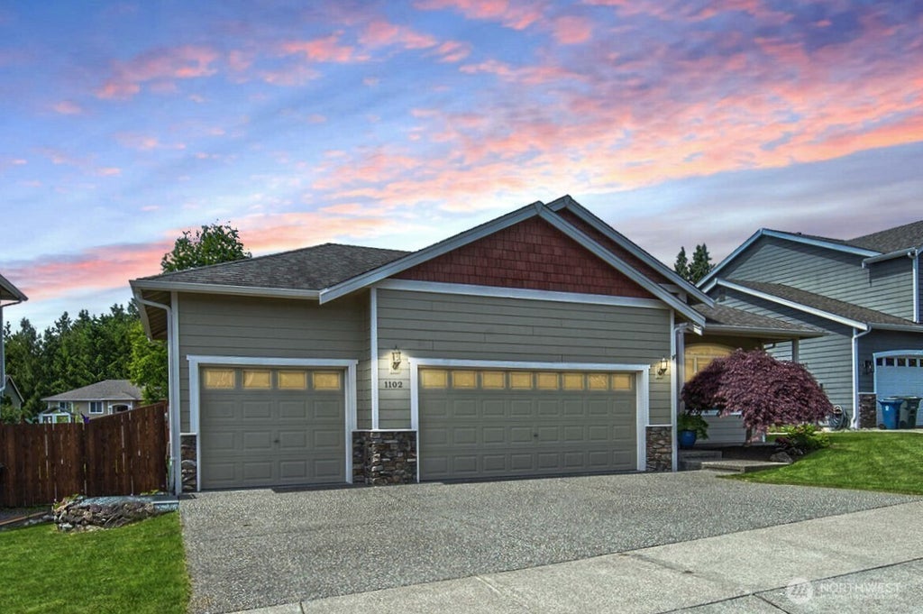 Welcome to this stunning rambler on a private street in the highly sought-after Fobes Hill area. This beautifully maintained home offers an open layout with gleaming hardwood floors, vaulted ceilings, and a cozy gas fireplace. The bright, modern kitchen features a center island, Quartz countertops, stainless-steel appliances, and a casual dining area—perfect for entertaining. This home has 3 bedrooms, including the spacious Primary Suite with vaulted ceilings, a walk-in closet, and a luxurious five-piece bath with a soaking tub. Fully fenced backyard is beautifully landscaped with lush greenery, offering a tranquil space for relaxing or entertaining. Enjoy a 3-car garage, A/C, and a 40-amp for an EV outlet. Minutes from downtown Snohomish!
