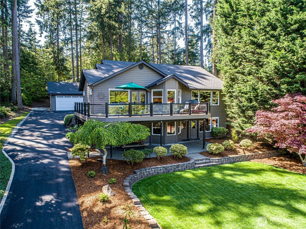 Experience waterfront living on this gorgeous park-like property with stunning details throughout the home plus main-floor primary suite and full apartment with private entrance on the lower level, ideal for multi-generational living or rental potential! Open concept living area boasts a light-filled kitchen with high-end appliances. Step out on the entertainment-sized deck to enjoy the lake & Cascades view or watch the eagles soar overhead. Lower level also includes 5th bedroom, 2 more living areas, cozy radiant floor heat, and tons of storage. Carport & 2 car garage with workshop space & EV charging. Private dock has covered boat lift. Newer roof & heat pump, wired for generator – truly too many amenities to list!