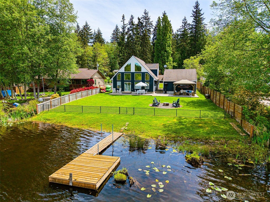 The coziest 2-bedroom + BONUS ROOM lakefront home on serene Lake Symington! This peaceful place features a fully fenced backyard with a private dock, large patio, fire pit, and stunning views of The Brothers and Mt Jupiter. Enjoy kayaking, fishing, and watching abundant wildlife from your yard. Inside, an updated kitchen opens to an A-frame living space with soaring windows that fill the home with light and frame the lake views. Upstairs, the spacious primary suite offers a walk-in closet and ensuite bath. Updates include: 2021 - roof, paint, W/D, heat pump, dishwasher; 2024 - refrigerator, garage fridge, oven, microwave. Built-in generator switch, 2-car garage with attic storage, and breezeway to the home. Close to PSNS, Bangor & Shopping.