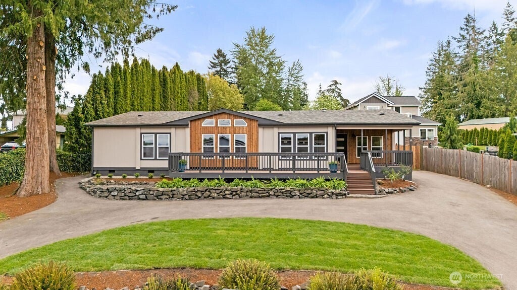 Stunningly remodeled triple-wide manufactured home that feels like a dream!This 3-bed,2.5-bath beauty offers vaulted ceilings,sun-filled open layout&a jaw-dropping 5-ft fireplace with an accent wall.The kitchen is a showpiece—soft-close cabinets,floating shelves,walk-in pantry,and large island with accent lighting.The primary suite is pure luxury with its own accent wall and spa-like bath featuring barn doors,freestanding tub,double vanities&custom-tiled shower.Large walk-in closets,oversized 2-car garage,new furnace, newer roof.Step outside to your private oasis—waterfall,outdoor fireplace,lush landscaping&garden space.Covered large porch,roundabout driveway,& Lake Tapps access via Community Park.Award winning Sumner school district!