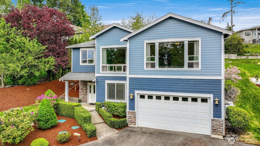 Welcome to this 3-bedroom, 3-bathroom home with a large rec room plus an office, minutes from downtown Blaine, the pier, and I-5 access. This well-maintained home offers a spacious 2-car garage and extra off-street parking. The main living area on the second floor is filled with natural light from large west-southwest facing windows that provide partial views of the islands. The kitchen features granite countertops and stainless steel appliances. A wood stove adds a cozy touch in winter. The primary bedroom includes an ensuite bath with separate tub and shower and patterned tile finishes. Stone-accented facade, beautifully landscaped property, large backyard, storage shed, and a water feature you can enjoy from the deck. Come take a look!