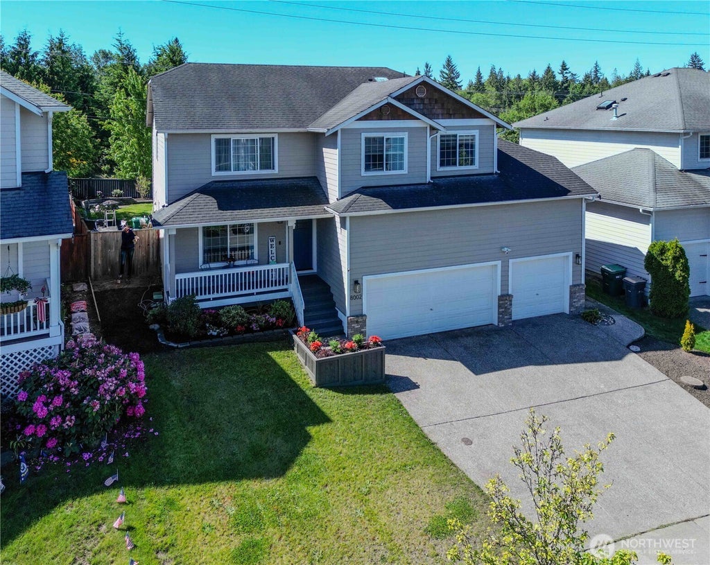 MOVE-IN READY! This updated home in a charming neighborhood offers territorial views near a playground and Gleneagle Golf Course. Remodeled in 2022, this property features high-end finishes, including a modern kitchen, a vaulted bonus room, and a flex space suitable for dining or a home office. The primary suite features a soaking tub, heated floors, and premium fixtures, while smart lighting, SPC flooring, and memory foam carpet padding enhance the overall comfort. Outside, a TimberTech deck and irrigation system create a welcoming retreat. The three-car garage features extra-high ceilings + ample storage space. Convenient to I-5, Hwy 9, Centennial Trail, and downtown Arlington!