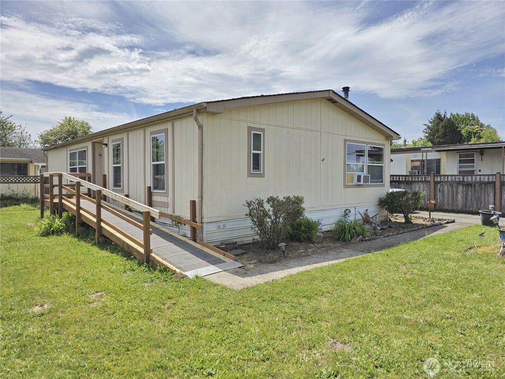 Located in a peaceful 55+ community at the end of the park for added privacy, this 1988 home offers comfort, convenience, and great outdoor space. The updated kitchen features pine cabinets and tile floors. A wood stove in the dining area helps keep utility bills low. The primary bedroom offers a wide opening to the bathroom for easy access. Outside, enjoy a new ramp to the front door, carport, storage shed, woodshed, garden area, and backyard space. All appliances stay, plus lumber to help rebuild the fence, and some additional building material and interior paint are included so you can add your personal touches.