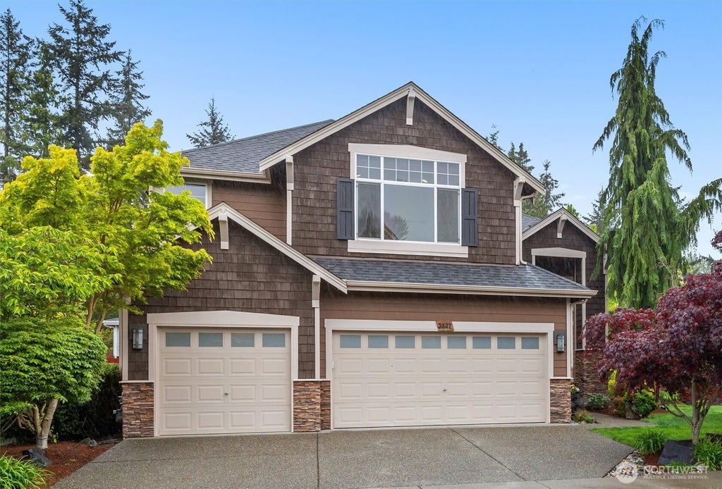 This beautiful 3-bedroom home in coveted Brookside Estates resides next to a lovely neighborhood park. The inviting living room with Brazilian cherry hardwoods, wood-wrapped windows, and vaulted ceiling brings in abundant natural light. The gourmet kitchen with butler's pantry & SS appliances opens onto a spacious family room w/cozy fireplace. Step outside to the large patio, perfect for relaxing or dining al fresco. The versatile layout includes a dedicated main floor office and a sumptuous primary suite with a 2-sided fireplace, dual closets, and a bonus room, ideal for a nursery or flex space. You will appreciate the new carpet, central A/C, and a new hot water tank. Walk to Cedar Wood Elementary and minutes to Mill Creek Town Center!