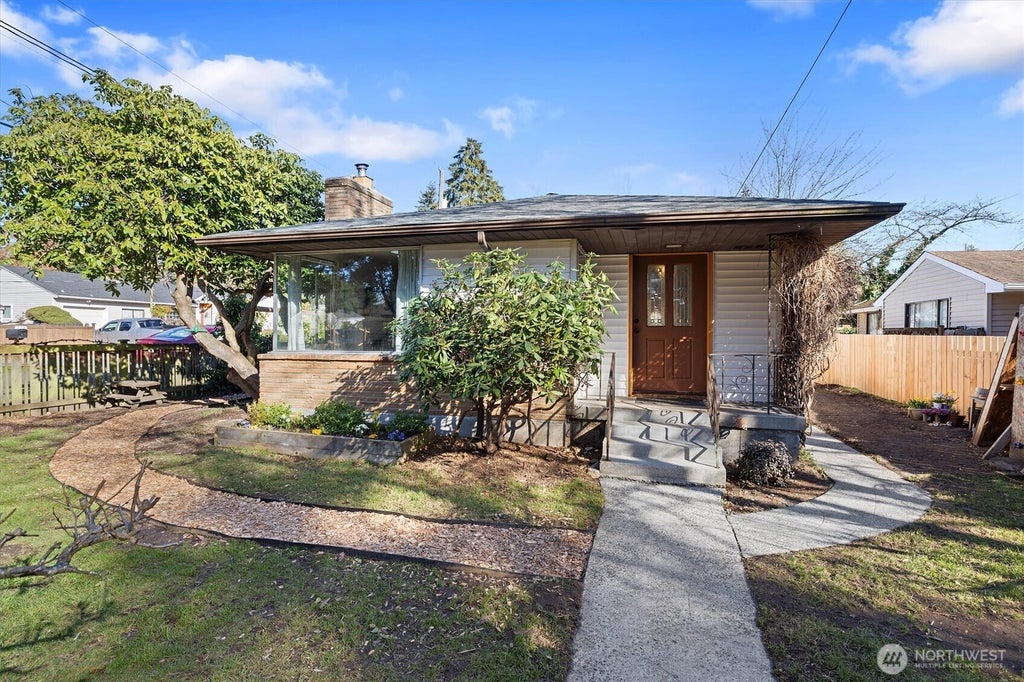 This beautifully maintained mid-century home is super-well-located, close to the QFC shopping center, Carkeek Park, & several bus lines! A covered entry porch leads to a light-filled living room boasting corner windows, sunlights & a Roman-brick fireplace; the sizable formal dining room can host a decent-sized party, and the pass-through galley kitchen features ample cabinetry, granite countertops, and has a sunny picture window above the sink! Gleaming solid oak hardwoods run throughout the home, and there’s an ensuite BR w 3/4 bath! The laundry area is daylit – imagine that! - plus there’s a carport and a two-room outbuilding for your gym/studio/whatever and even more storage! Freshly painted and move-in ready!