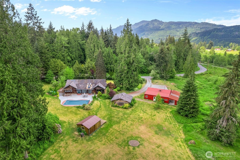 Step outside to the beauty of Blanchard Mountain, where hiking trails await. This property offers the perfect space for a hobby farm—grow your garden or tend to animals, all while enjoying the peace and quiet of nature. Inside, large windows fill the home with light and showcase garden views. The sunroom is an inviting space to unwind, and natural elements like cedar trim and walnut flooring add warmth. With four versatile rooms, a shop ready to become a barn, and a pond and creek, this property offers endless possibilities. The swimming pool is awaiting your vision. Enjoy privacy while still being conveniently close to Bellingham and Burlington in this peaceful retreat with room to grow and create your dream lifestyle.