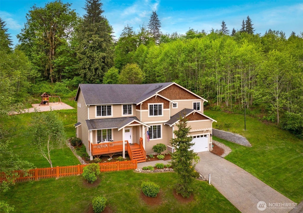Welcome to this inviting home in the desirable Three Lakes community, ideally located between Snohomish and Monroe with easy access to scenic lakes and trails. Fresh landscaping and a re-stained deck greet you, while inside, the formal dining room is bright and spacious. A cozy fireplace anchors the living room, flowing into a casual dining area and well-equipped kitchen with pantry, coffee bar, and garage access. A main floor bedroom with full bath is perfect for guests, plus an office for remote work. Upstairs offers two flex rooms, a vaulted primary suite with walk-in closet and 5-piece bath, three more bedrooms, a full bath, and laundry—comfort and functionality for every stage of life. Enjoy the privacy of your back yard & deck!