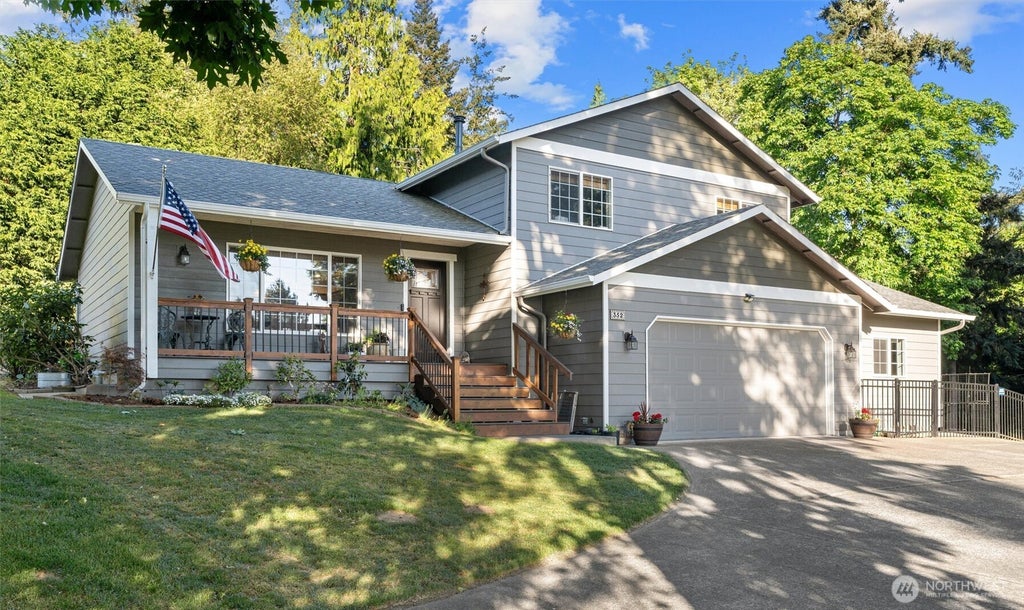 Island living at its finest! Sought after Madrona neighborhood with stunning water and sunset VIEWS, plus your own private oasis on almost one ACRE! Tastefully updated 4-bedroom, 2.5-bathroom home with open concept main floor design, perfect for entertaining. Additional living space on lower level with propane fireplace, utility room/half bath and guest bedroom with separate entrance (possible MIL opportunity). Upstairs features primary suite with ceiling fan, modern bathroom with barn door and 2 additional guest bedrooms with VIEWS! Huge yard with garden space, fruit trees, firepit and brand-new fence! No HOA, tons of parking for RV/boat and potential room for a SHOP! Don't miss the community BEACH just a few blocks away!