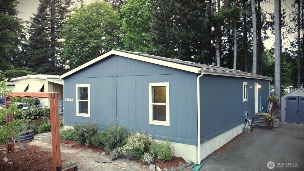 Fresh Price Stunning 2018 modular home, sited on its own land, offers a seamless blend of contemporary design and practical living. Air Conditioned! Spanning 1,279 square feet, include 3 spacious BRs ,2BA. Step inside to discover a bright and airy living space enhanced by skylights, inviting natural light. The open island kitchen, equipped with a dishwasher and refrigerator, offers an ideal space for culinary adventures and entertaining guests. Enjoy the convenience of carpet and LVT Hardwood floors throughout, providing a sophisticated yet cozy ambiance. Additional amenities include EV charger, Air Conditioner/heat pump, shed and community club house. NO age Restrictions. PETS OK Private, quiet and quality built.Holly Hills Bothell. A/C