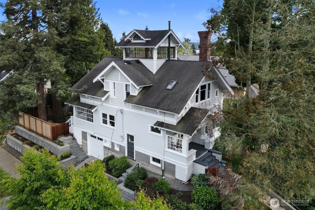 Sunset Hill Craftsman featuring period detail & charm, with the convenience of modern updates throughout. Exceptional quality & detail with original woodwork, restored windows, Fir floors, & more. Spacious living + dining areas with custom wood burning fireplace & cozy window seat, plus convenient main level den/bedroom. Four light & bright bedrooms & remodeled bathroom on 2nd level. Stairs lead to a one-of-a-kind loft, the perfect perch to take in the sunsets or skyline/Mt Rainier view. Fully finished basement with media room, remodeled bath, laundry + oversized garage with tons of storage. Spacious backyard and patio + sunny west facing deck, all fully fenced. Easy access to Sunset Hill Overlook, Golden Gardens, & all Ballard amenities.
