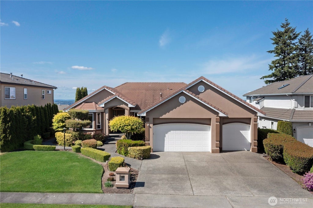 Exquisite rambler with a breathtaking Puget Sound, mountain range & city view + $100K in refined upgrades including A/C! Home has vaulted ceilings, skylights & upgraded lighting throughout~Kitchen with eating space is open to the LR & has elegant granite counters & a walk-in pantry~The living room has an expansive Sound view, floor to ceiling stone faced fireplace & opens to the patio~The dining room offers ample space for entertaining with effortless charm~The large office with French doors is full of light~The primary has a view, fireplace, small flex room & luxurious stand alone tub~The well manicured yard is fenced & has a sprinkler system~Top this off with a 3-car garage with an Epoxy-coated floor & NO HOA! A true retreat inside & out!