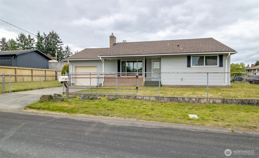 Sweet rambler waiting for a new owner to add their own vision and personal touch. Three-bedroom, one-bath home nicely cared for. Spacious kitchen with eating area. Independent laundry area with storage cabinets. Wood-burning fireplace, double-pane windows throughout, newer roof, water heater installed in 2015, quality vinyl siding. One-stall garage with work space and large storage loft area with easy stairway access. Level and fenced, easy-care yard. Enjoy covered front porch with planter box. Good walkability to transit, shopping and restaurants.