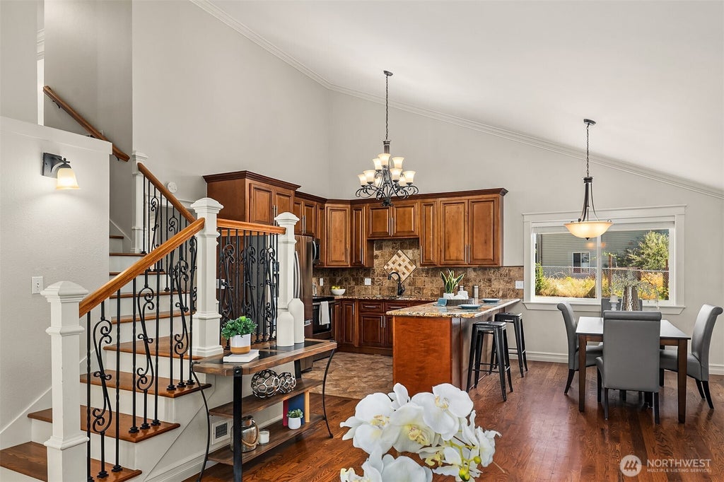 Spacious. Serene. Surprising. Tucked away in a quiet Tacoma community, this beautifully updated 3-bed, 2.5-bath home sits on an expansive lot and offers the perfect blend of comfort and style. Soaring vaulted ceilings, rich hardwoods and a striking iron staircase make a bold first impression. The oversized kitchen offers abundant storage and flows seamlessly to a large rec room that opens to a massive deck and fenced backyard perfect for entertaining. Upstairs, the spacious primary suite features a private balcony, remodeled ensuite, and walk-in closet. Two additional bedrooms, a full bath, an office shed, a storage shed, a newer roof (2019), and fresh exterior paint and carpet (2025) round it out. Minutes to I-5, JBLM, shopping and parks!