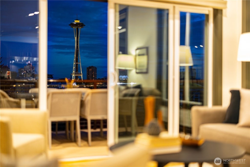Soak up iconic Space Needle views and sleek modern style in this Queen Anne stunner. Vaulted ceilings and walls of windows flood the top floor with natural light, while a spacious deck with built-in gas grill sets the scene for sunset dinners, sparkling city lights, and NYE fireworks. The open kitchen features gas cooking, island seating, and a dumbwaiter to deliver groceries from your private garage. The primary suite also features epic city views and a spa-like 5 piece bath complete with heated floors. Downstairs, a built-in desk + Murphy bed = perfect 2nd bedroom or WFH flex space. On a quiet street, with a Walk Score of 92 you are close to everything— QFC, amazing food choices, Amazon, Meta, Google, Kraken games, concerts, & cocktails.