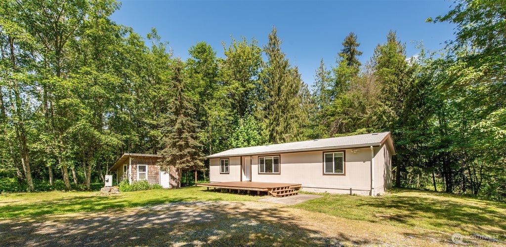 Perfect hideaway nestled on 2.5 acres! Brand new roof just completed June 2025! This 3 bedroom, 2 bath manufactured home features an open layout with generous kitchen, breakfast bar, and split bedroom floor plan. The 1104 square feet lives like a larger home due to the efficient design. Large, south-facing Trex deck offers a relaxing spot to enjoy the sunshine. Private, wooded setting with no HOA. Outbuilding for storage, private well and septic.