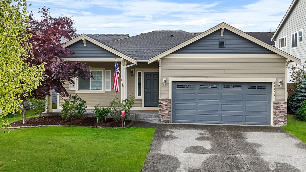 Nestled in the desirable Tahoma Terra neighborhood, your 3bdrm rambler awaits! Gorgeous engineered hardwood flooring throughout (no carpet!). Fabulous open concept Living space with gas fireplace. Stainless appliances in Kitchen with full tile back splash, granite counters, & island counter with eating bar. Attention to detail: two-tone paint with crown molding; ceiling medallions; recessed lighting; 2-panel doors. The spacious Primary Suite offers walk-in closet plus private bathroom with soaking tub & walk-in shower. Heat pump with AC keeps the home the perfect temp year round! Second Primary Suite with private bathroom (walk-in shower). Landscaped, fully fenced w/patio. Close to schools, shopping, & an easy commute to JBLM.