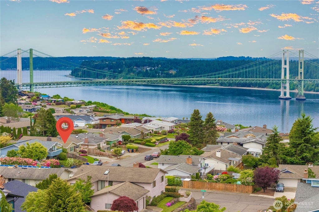 This home is a joy now, and will be for many years to come. 3400 ft2 with glorious Olympic, sunset and Narrows views. Sophisticated choices have been made to enhance, refine each space. E.G. wires and outlets have been hidden in walls. It is simultaneously warm, gracious, elegant and homey. Main floor features huge, light-filled family room with gas fireplace, & brkfst nook that opens to deck. The updated kitchen has SS appliances, wood cabinets, quartz counters, tile backsplash. Grand-piano-sized liv/din rm w/gas fireplace. 3 main floor bdrms including primary bdrm has a elegant 3/4 bthrm. Lower level has 1200 ft2 of finished flex space. Fenced above ground pool, heated gazebo, gorgeous yard make the outdoors as perfect as the inside