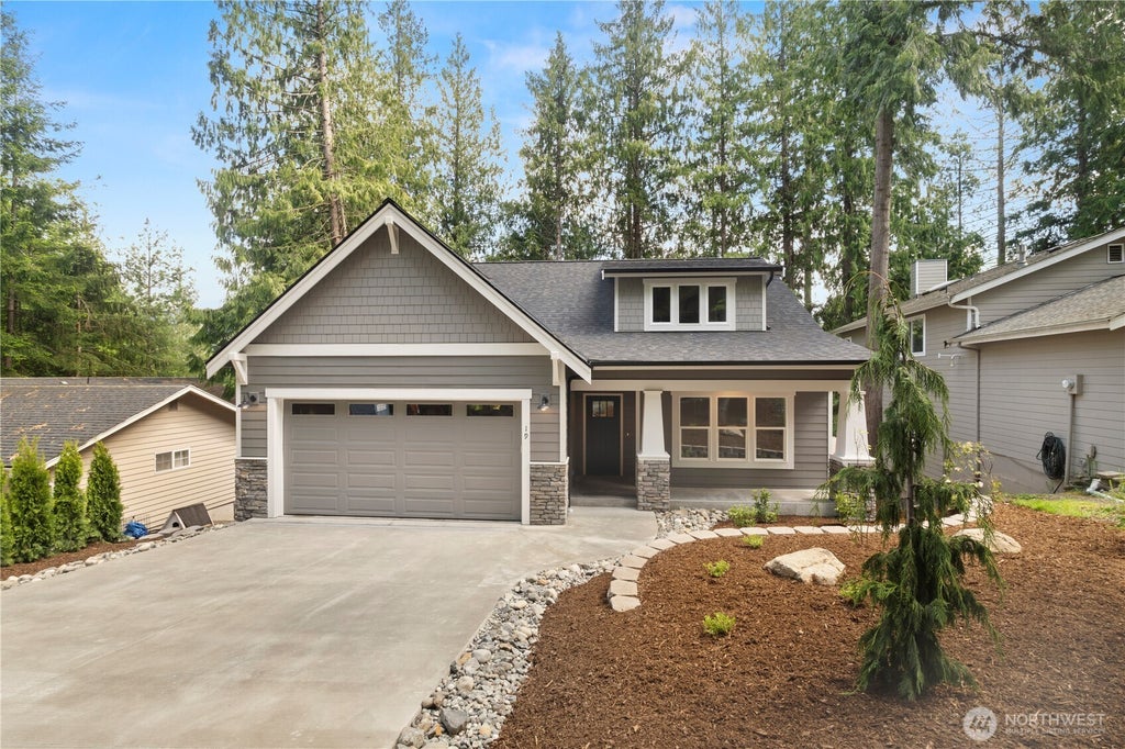 Enjoy this newly completed, craftsman style home with an open concept floor plan. The gently sloping lot allows for a comfortable entrance to the home. Quality finishes throughout with classic touches such as a built-in bookshelf, barn door and stone finished fireplace. Strategically placed windows provide a sunny, bright living experience. The home offers two separate decks to enjoy outdoor living. The kitchen offers white painted cabinets, quartz countertops and high-end stainless-steel appliances. The primary bedroom is located on the main floor adjoined by a beautifully finished bathroom consisting of heated floors, a standalone tub, tiled shower and walk-in closet. Over 1000 sf of unfinished space offering unlimited potential.