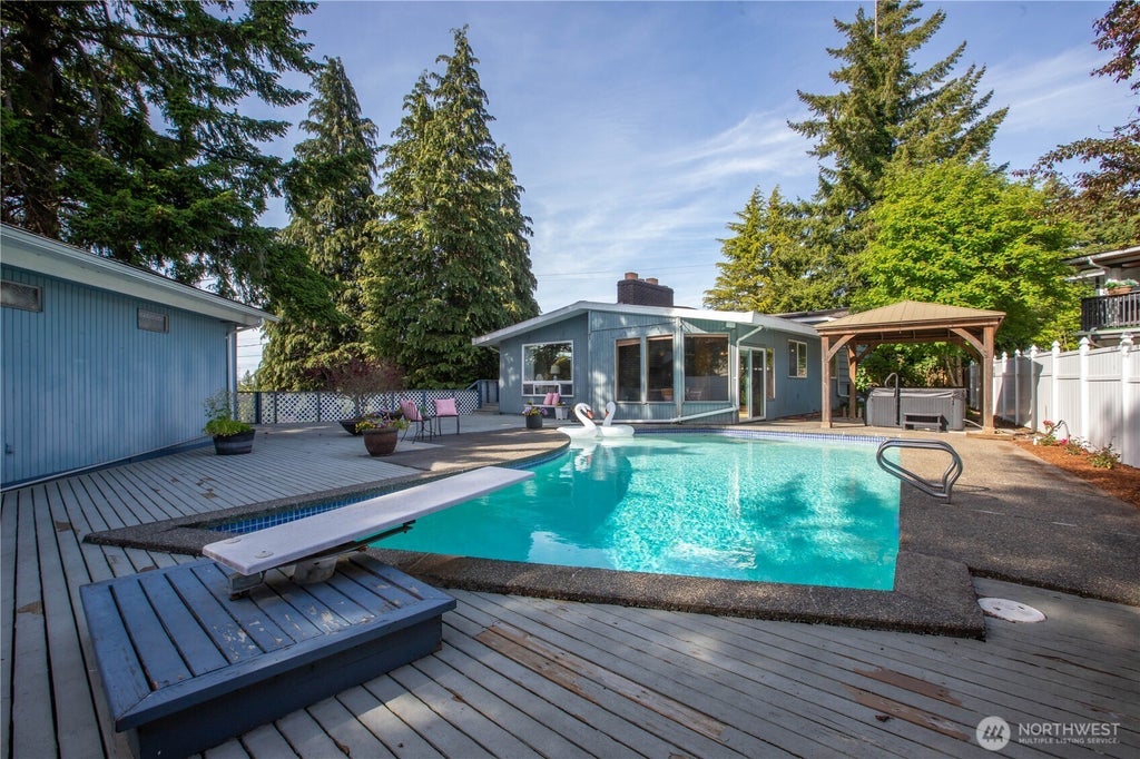 This spacious 5-bedroom home with a pool is perfectly situated in a desirable University Place neighborhood. Designed for entertaining, it features a sunroom, generous living room, and a welcoming living room with fireplace. The detached structure in the backyard includes a bathroom with a shower and sauna, offering excellent potential for conversion into an ADU with updates. The home needs some TLC but has strong bones and incredible potential to become your dream space. Enjoy a peek-a-boo water view from the front porch that shines in the winter. Conveniently located near shopping, dining, top-rated UP schools, and highways. Sold As-Is. Buyer credit with a full price offer.