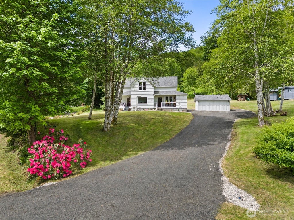 Perched on a gentle rise with Willapa River views, this home offers charm, warmth, and room to breathe. Surrounded by mature trees, it features a welcoming front porch, original hardwood floors, cozy wood stoves, and thoughtful details throughout. The light-filled kitchen includes open shelving and a walk-in pantry ready for your staples or canning stash. Unwind in the spa-like bath with soaking tub, tiled shower, and peaceful views. Two porches offer quiet places to relax. Outside, enjoy multiple outbuildings, a detached garage, and open space to garden, raise animals, or just enjoy the setting. Peaceful, practical, and full of character—this home is ready for its next chapter.