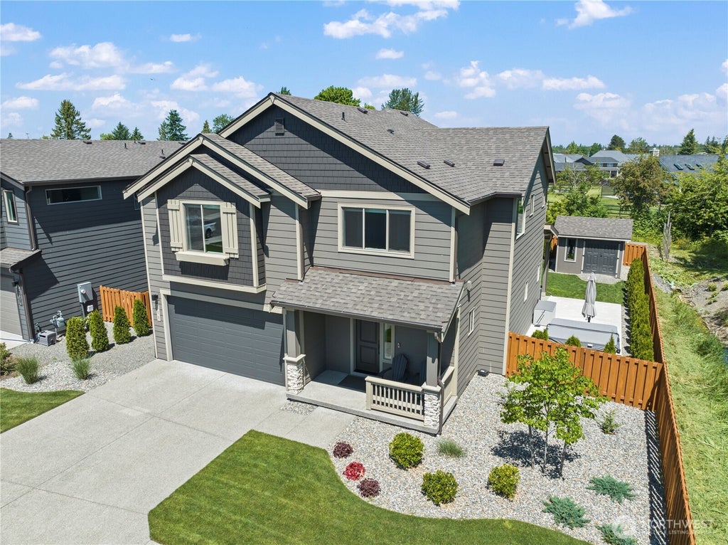 Immaculate, Mt. Rainier view, 2,464SF, 3-bed + loft/bonus, 2.5 bath home, perfectly situated on an oversized 9,159SF lot offering tons of off-street parking & privacy. Open concept Kitchen/Living/Dining w/ SS appliances, Quartz countertops, huge island, & LVP flooring. Vaulted owner's suite w/ private 5-piece bath, walk-in closet, & giant dual sink vanity. Lg. 3rd bedroom w/ walk-in closet. Laundry up w/ added matching cabinets. All the post new construction projects are complete like, landscaping + sprinkler system, additional poured concrete patio wired for hot tub, upgraded trim/shelving package + blinds, finished/painted garage wired for EV charging, garden shed, & more. This is truly a MUST-SEE home tucked away on a prime lot!