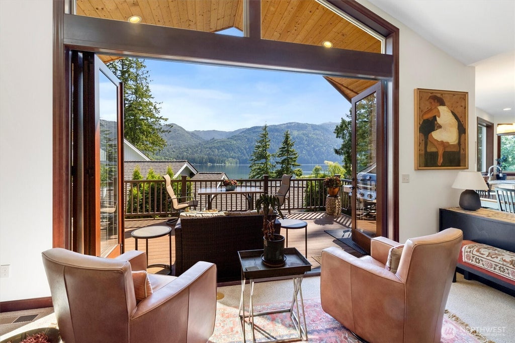 Enjoy luxury living at the lake from this custom home with panoramic views of Lake Whatcom and the mountains—ideally located in Sudden Valley’s coveted Gate 1, steps from beaches, marina, and lakefront dog park. A stunning setting for entertaining, the vaulted great room with bi-fold doors opens to a large deck with stone fireplace—seamlessly blending indoor-outdoor living. The chef’s kitchen features double ovens, a large island, farmhouse sink, and walk-in pantry. French doors lead to an office with a cozy balcony. The first floor with 2 bedrooms, living room, and kitchenette is ideal for guests or multi-generational living. Elegant curb appeal with soaring rooflines, stone accents, and paver drive to an oversized 28'x28' garage.