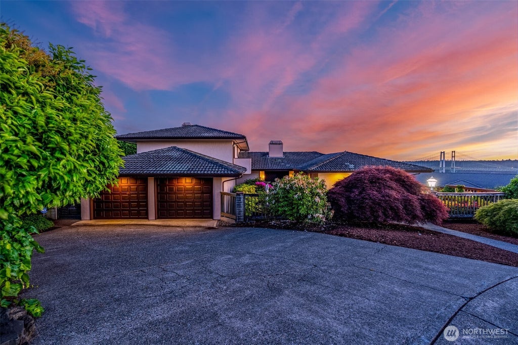 Stunning NW contemporary offers unparalleled views of the Sound, Olympics, Narrows Bridge & breathtaking sunsets. Private, gated entry welcomes you to this Entertainer's Paradise featuring a light-filled living area, gas fireplace, wet bar & sunroom. Kitchen is a chef’s dream w/soft close drawers, premium appl (Wolf, Dacor, Sub-Zero) & exquisite granite. Amenities incl radiant heated travertine floors, elec window treatments & built-in vacuum. Expansive upstairs primary ste boasts 2 closets, 2 decks, luxurious tub, steam shower & gas fireplace. 2 bedrooms & full bath on main floor. Backyard oasis is ideal for entertaining, gardening or relaxing by the pool/spa. Nestled in a quiet cul-de-sac near shopping, dining, schools, parks & freeways.
