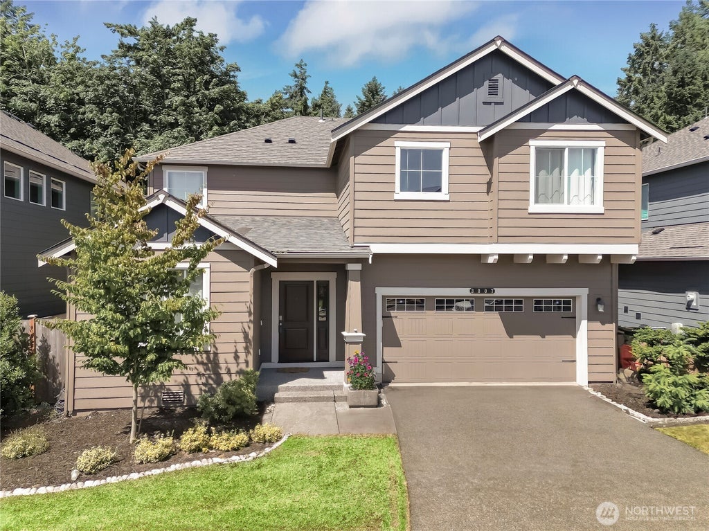 Welcome to Gateway! This like-new 2020 Home is centrally located in a lovely scenic neighborhood with parks, walking trails, and easy access to all amenities. The main floor features a guest bedroom with full bath and a separate den, while upstairs offers a large primary bedroom with luxurious 5-piece bath, 3 additional spacious bedrooms and convenient laundry room. Highlights include a large quartz kitchen island, stainless steel appliances with gas stove, SmartHome tech, A/C for warm summer days, and EV charging. Enjoy wooded views and privacy from your fully fenced backyard. Close to schools, shopping, I-5, and JBLM!